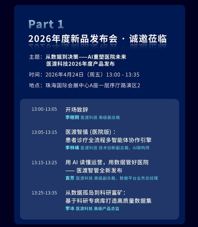 另据最新消息,医渡科技将于24日在CHIMA大会上举办“AI重塑医院未来-2026年度新品发布会”,届时将正式推出“医渡智循”医院版、医渡智管等全新AI医疗产品。