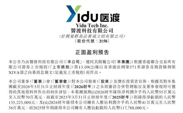 4月20日,国内AI医疗头部企业医渡科技(2158.HK)发布了一则令市场振奋的盈利预喜公告。公告显示,公司预计截至2026年3月31日止的2026财年将录得净利润约5500万元至7000万元人民币,实现公司自成立以来首个全年盈利。这一里程碑式的突破,标志着医渡科技正式跨过了从“烧钱布局”到“自我造血”的关键分水岭。